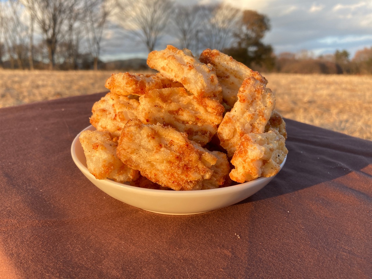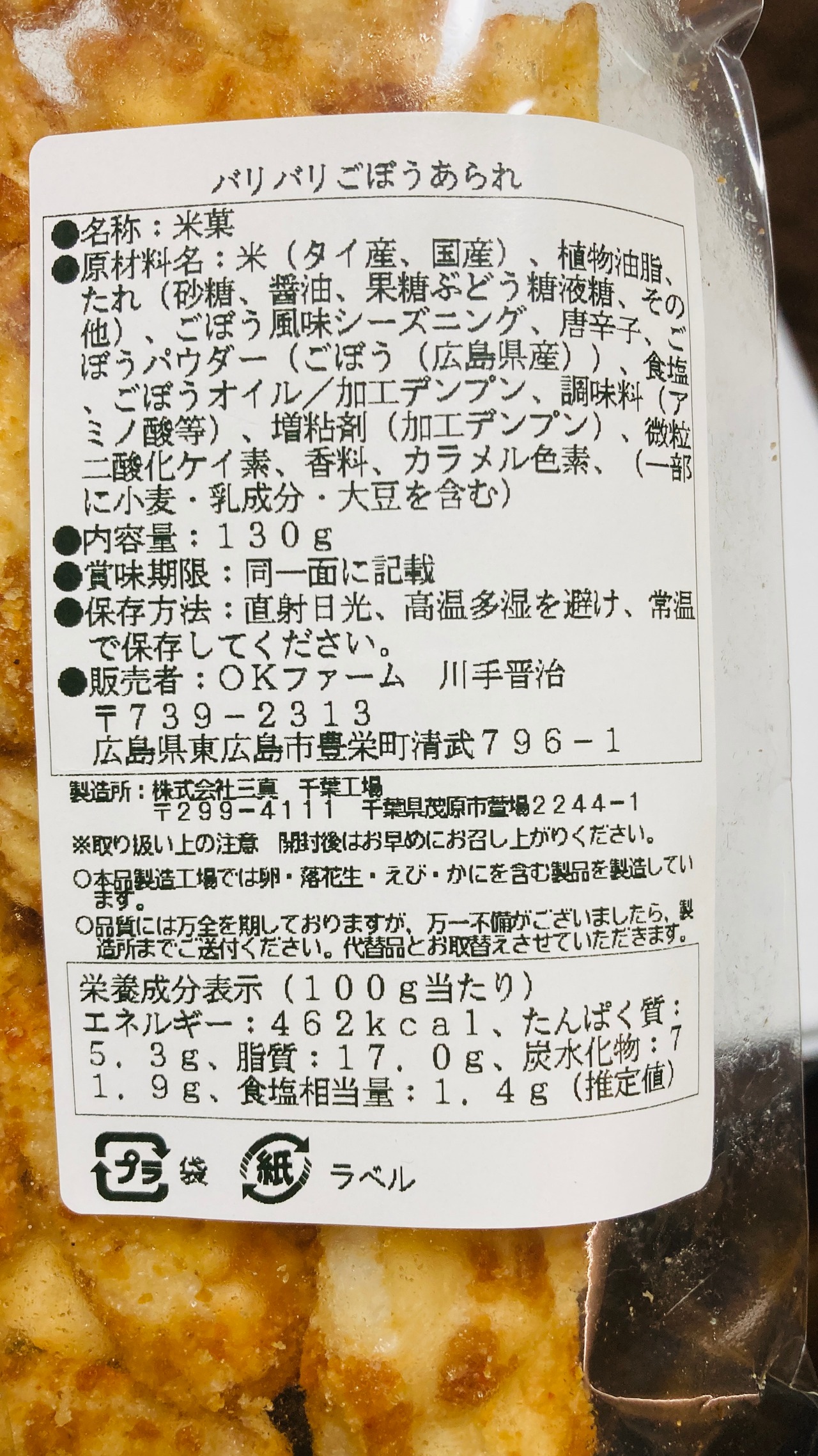 ♦OKファームの自慢の野菜、「OKごぼう」を乾燥させ、粉砕して作ったパウダーをふんだんにアラレにまぶしました。